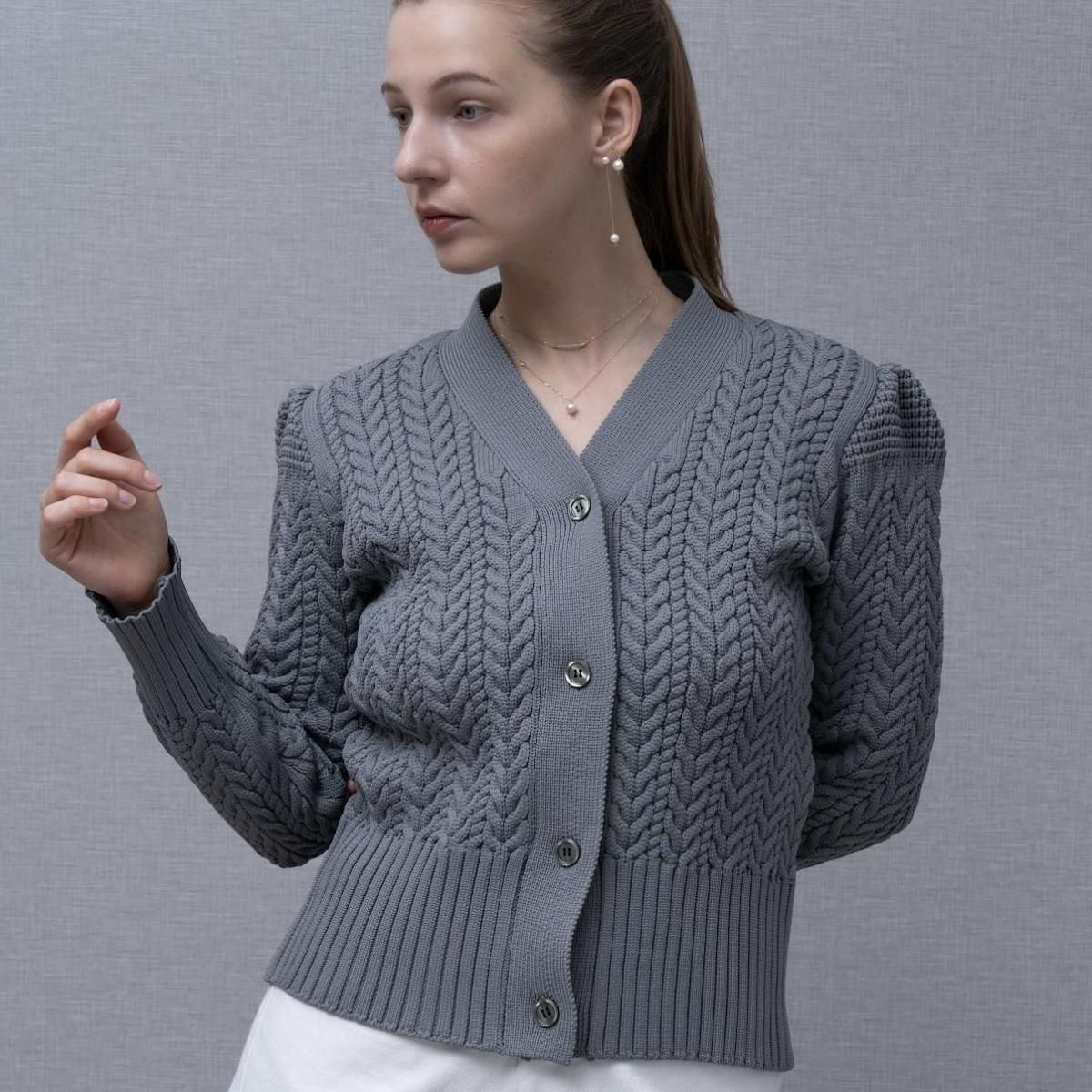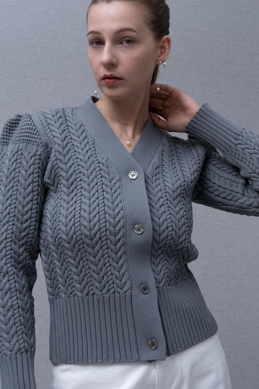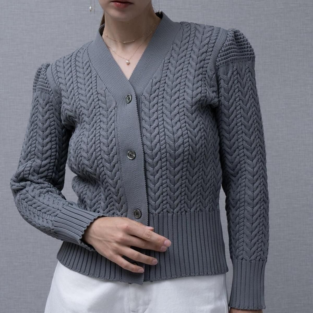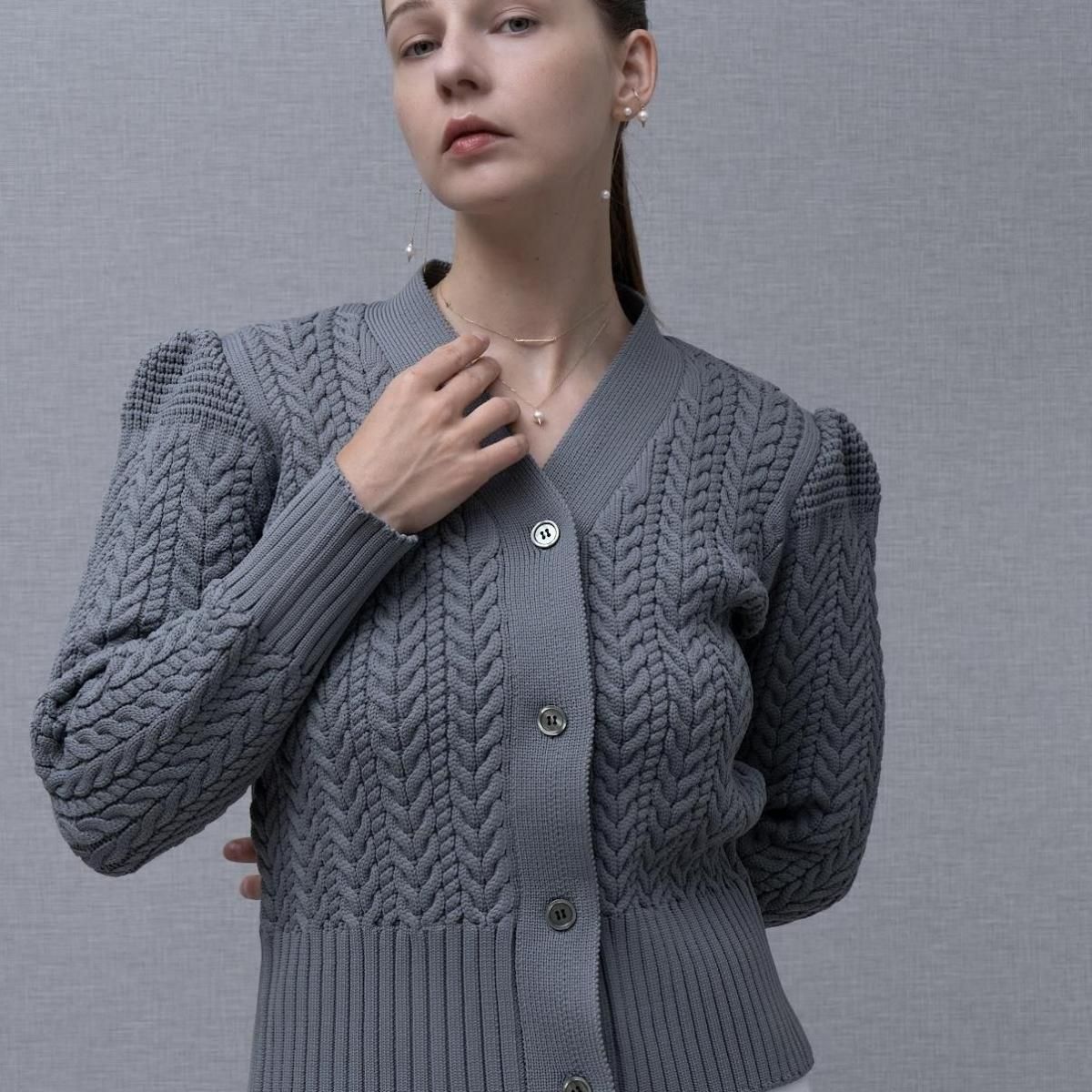 肩のぷっくりしたパフショルダーと三つ編みのような編み地がポイントのカーディガン。