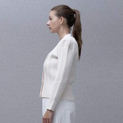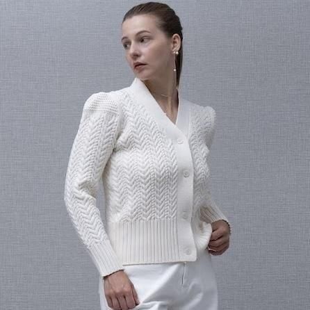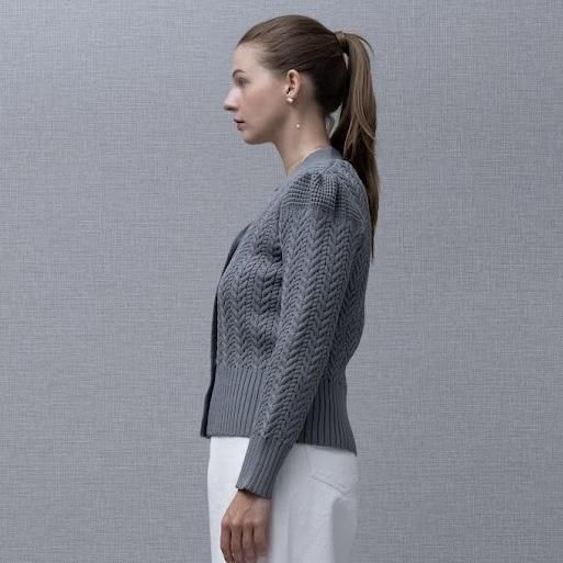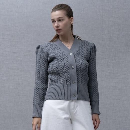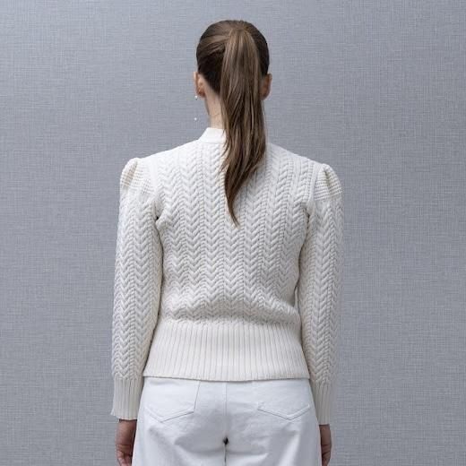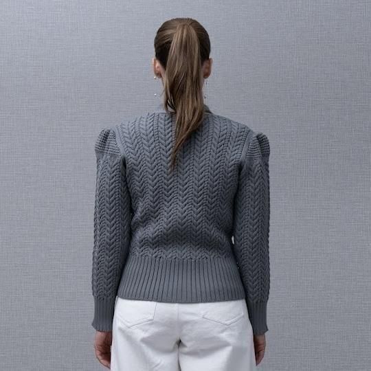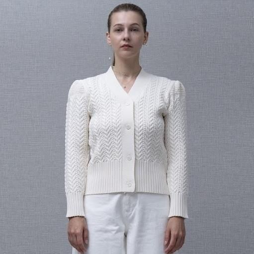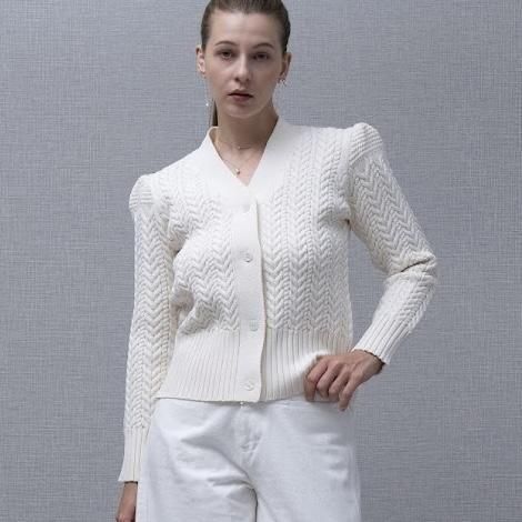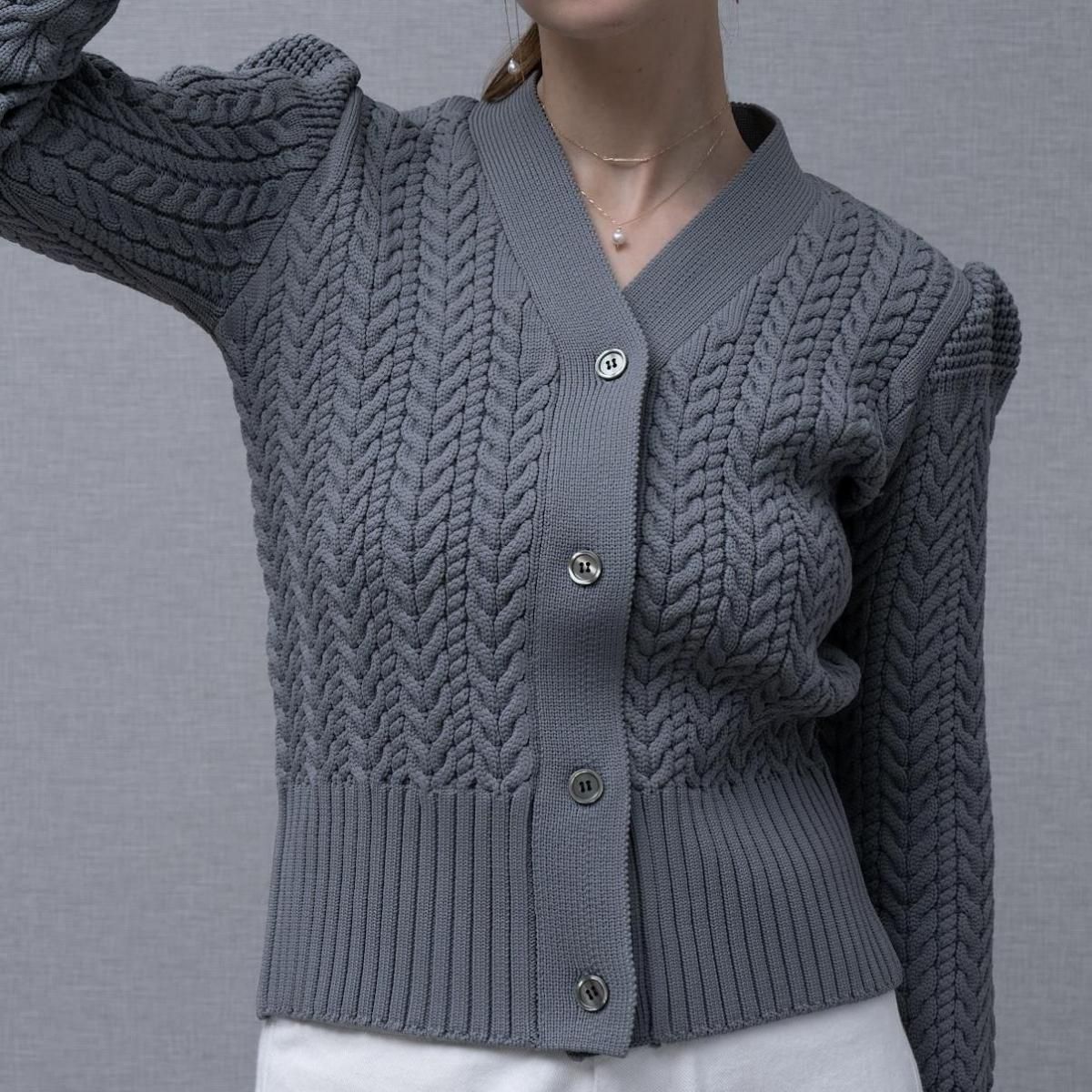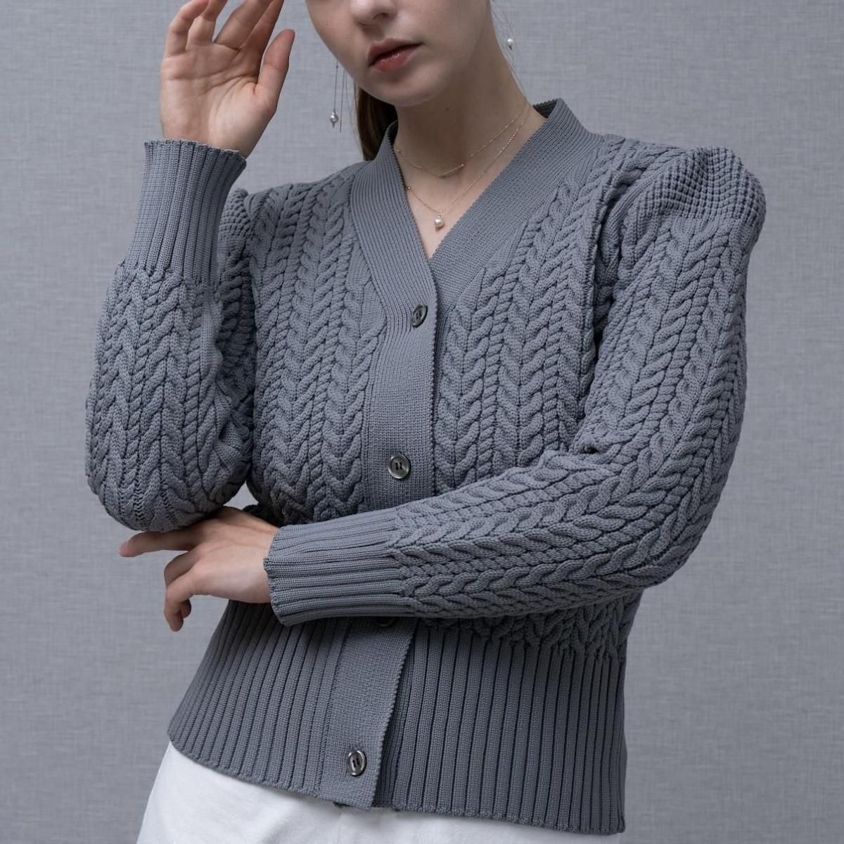 肩のぷっくりしたパフショルダーと三つ編みのような編み地がポイントのカーディガン。